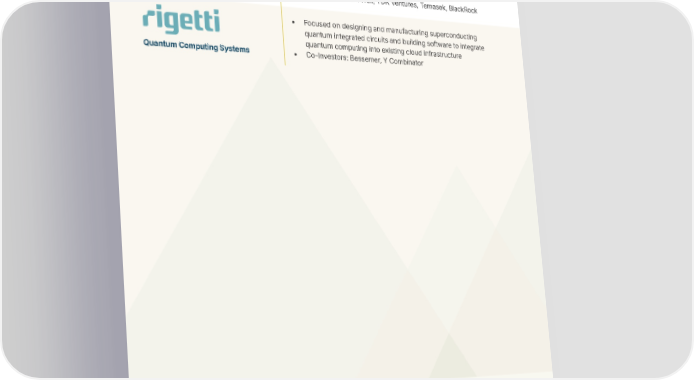 10 NOTE: No representation is intended that the outcomes shown or discussed are representative of the outcomes experienced by any AV fund or investor. Co-investors listed are for illustration purposes only. These co-investors are some that AV has historically co-invested with and is not a predictor of future co-investors for any given portfolio company. There is no guarantee of who will be the co-in- vestors in any given investment, and the identity of a co-in- vestor is not necessarily predictive of investment outcomes. Important Disclosure Information: The manager of the AV Funds is Alumni Ventures (AV), a venture capital firm. AV and the funds are not affiliated with or endorsed by any college or university. These materials are provided for informational purposes only. Offers of securities are made only to accredited investors pursuant to each fund’s offering documents, which describe among other things the risks and fees associated with the Fund that should be consid- ered before investing. The funds are long-term investments that involve a substantial risk of loss, including the loss of all capital invested. Past performance is not indicative of future results. Opportunities to invest in any security (of a Fund, of AV or in a syndication offering) is not a guarantee that you will be able to invest and are subject to all terms of the specific offering. Diversification cannot ensure a profit or protect against loss in a declining market. It is a strategy used to help mitigate risk. Any investment performance or outcomes discussed with you is provided for illustrative purposes only. Except where expressly noted, no representation is intended that any investment outcome shown or discussed is, or would be, representative of results obtained by any fund or investor associated with AV. F22-X0737-250115.01 10 • Developer of a proprietary recycling process focused on lith- ium-ion batteries for Electric Vehicles that recovers/reuses cathode materials • Plans in 2025 to produce >99% pure, sustainable lithium carbonate from used lithium-ion batteries • Co-Investors: Fifth Wall, TDK Ventures, Temasek, BlackRock Lithium-Ion Battery Recycling ALUMNI VENTURES 2025 APEX 50 av.vc • Focused on designing and manufacturing superconducting quantum integrated circuits and building software to integrate quantum computing into existing cloud infrastructure • Co-Investors: Bessemer, Y Combinator Quantum Computing Systems