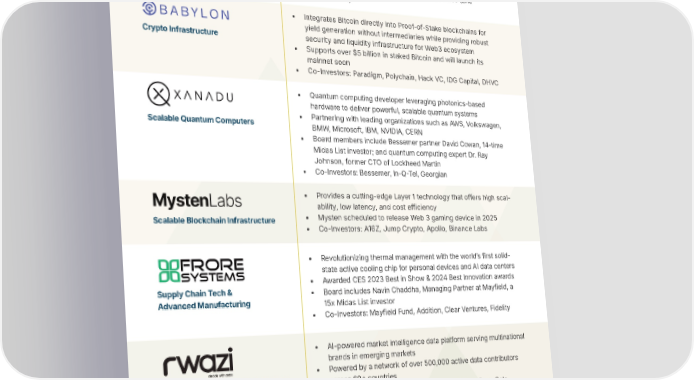 9 9 • Altera’s AI system uses computational neuroscience to enable AI agents to have similar social-emotional cognition as humans • Partnered with major gaming studios and Open AI • Unveiled an agent capable of playing Minecraft with others • Co-Investors: a16z, Patron, and First Spark Ventures (Eric Schmidt’s fund) AI Characters for Gaming • Integrates Bitcoin directly into Proof-of-Stake blockchains for yield generation without intermediaries while providing robust security and liquidity infrastructure for Web3 ecosystem • Supports over $5 billion in staked Bitcoin and will launch its mainnet soon • Co-Investors: Paradigm, Polychain, Hack VC, IDG Capital, DHVC Crypto Infrastructure • Quantum computing developer leveraging photonics-based hardware to deliver powerful, scalable quantum systems • Partnering with leading organizations such as AWS, Volkswagen, BMW, Microsoft, IBM, NVIDIA, CERN • Board members include Bessemer partner David Cowan, 14-time Midas List investor; and quantum computing expert Dr. Ray Johnson, former CTO of Lockheed Martin • Co-Investors: Bessemer, In-Q-Tel, Georgian Scalable Quantum Computers ALUMNI VENTURES 2025 APEX 50 av.vc Supply Chain Tech & Advanced Manufacturing • Revolutionizing thermal management with the world’s first solid- state active cooling chip for personal devices and AI data centers • Awarded CES 2023 Best in Show & 2024 Best Innovation awards • Board includes Navin Chaddha, Managing Partner at Mayfield, a 15x Midas List investor • Co-Investors: Mayfield Fund, Addition, Clear Ventures, Fidelity • AI-powered market intelligence data platform serving multinational brands in emerging markets • Powered by a network of over 500,000 active data contributors across 60+ countries • Scaled with customers such as Red Bull, Nestle, Coca Cola, Kellogg’s, Estee Lauder • Co-Investors: Bonfire Ventures, Cherryrock Partners Emerging Markets Data Intelligence • Provides a cutting-edge Layer 1 technology that offers high scal- ability, low latency, and cost efficiency • Mysten scheduled to release Web 3 gaming device in 2025 • Co-Investors: A16Z, Jump Crypto, Apollo, Binance Labs Scalable Blockchain Infrastructure
