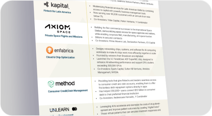 5 5 • AI-driven platform that turns unstructured data into actionable insights, enabling seamless integration and analysis of data across enterprises, unlocking operational efficiencies • Fast Company’s Most Innovative Company (2024) and Forbes AI 50 • Adoption by Fortune 500 companies; used by 50K companies • Co-Investors: Bain Capital, Madrona Venture Partners, Menlo Ventures Data Processing & Analysis Private Space Flights and Missions • Building the first commercial successor to the International Space Station, democratizing space access for space agencies and nations, while enabling corporate R&D, manufacturing, and space tourism • Billions in secured contracts • Co-investors: Prime Movers Lab, Declaration Partners, C5 Capital • Providing tools that give fintechs and lenders seamless access to consumer credit and debt accounts, enabling them to offer frictionless debt repayment options directly in apps • Has helped 200,000+ users connect $22 billion in consumer debt to their preferred financial institution • Co-Investors: Andreessen Horowitz, Y Combinator Consumer Credit/Debt Management • Modernizing financial services for Latin American SMBs by combining access to capital with powerful business management tools • Now serving over 90,000 customers with an annual churn rate below 1% • Co-Investors: Tribe Capital, Pelion Ventures, Y Combinator Fintech for Latin America • Designs networking chips, systems, and software for AI computing workloads to make AI chips work more efficiently together at scale • Founded by veterans from Broadcom and Alphabet • Launched the 3.2 Terabit/sec ACF SuperNIC chip, designed to enhance AI networking performance and support GPU clusters exceeding 500,000 GPUs • Co-Investors: Spark Capital, Sutter Hill Ventures, Atreides Management, NVIDIA Cloud & Chip Optimization ALUMNI VENTURES 2025 APEX 50 av.vc • Leveraging AI to accelerate and decrease the costs of drug devel- opment and improve patient outcomes by creating “digital twins” • These virtual patients that can simulate treatment responses and predict clinical outcomes • Being used for research into Alzheimer’s, ALS, and more • Co-Investors: 8VC, DCVC, Mubadala Capital AI Drug Development