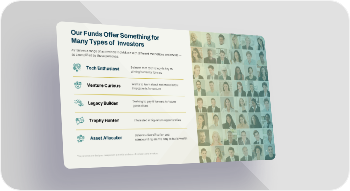 Our Funds Offer Something for Many Types of Investors Tech Enthusiast Believes that technology is key to driving humanity forward Asset Allocator Believes diversification and compounding are the way to build wealth AV serves a range of accredited individuals with different motivations and needs — as exemplified by these personas. The personas are designed to represent potential attributes of venture capital investors. 4 Wants to learn about and make initial investments in venture Venture Curious Seeking to pay it forward to future generations Legacy Builder Interested in big-return opportunities Trophy Hunter