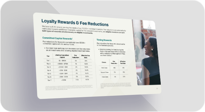 Closes Fee Reduction Effective Fee Rate First Close 10% 18% Second Close 5% 19% Final Close 0% 20% Fee reductions for those who cumulatively have $500K+ committed capital with AV and our funds. Our most loyal and long-term investors earn fee reductions on all investments after attaining eligible investment totals. Tier Lifetime Committed Capital Fee Reduction Effective Fee Rate Tier 1 $0 - $500K 0% 20% Tier 2 > $500K - $750K 1% 19.8% Tier 3 > $750K - $1M 2% 19.6% Tier 4 > $1M - $3M 3% 19.4% Tier 5 > $3M - $5M 4% 19.2% Tier 6 > $5M - $10M 5% 19.0% Tier 7 > $10M 7.5% 18.5% Fee reductions for those who invest earlier in the fundraise process. Investors joining the fund during the First or Second Close will be rewarded with a reduction of Management Fees as shown below.² We have built AV around serving the needs of our 10,000+ individual investors. Fee reductions are automatically reallocated towards additional investable capital for the relevant investments, and eligible investors can earn both types of rewards simultaneously on eligible investments. Timing Rewards 1. Each tier reward requires an investment above the threshold listed, e.g. $500,001 for Tier 2. AV may offer different fee reductions for funds offered through or in conjunction with financial partners with respect to certain bespoke funds for certain institutional investors or other specialized or new investment funds or offerings. All tier rewards remain subject to change at the discretion of AV without notice to investors. For more information, see here. 2. Eligible fund types include Alumni Funds, Focused Funds, Total Access Funds, and Community Funds. Ineligible fund types include Syndication Funds and Opportunity Funds. Timing rewards begin for eligible funds that have initial closes in December 2023 and onward. All Fee Reductions remain subject to change at the discretion of AV without notice to investors. For more information, see here. Committed Capital Rewards¹ Loyalty Rewards & Fee Reductions 20