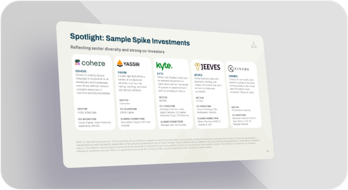 NOTE: For illustration purposes only. These investments are not intended to suggest any level of investment returns; not necessarily indicative of investments invested by any one fund or investor. No representation is intended that any result discussed is representative of the outcomes experienced by any AV Fund or investor. These investments are not available to future fund investors except potentially in certain follow-on investment options. The sample co-investors listed are some that AV has historically co-invested with and is not a predictor of future co-investors for any given portfolio company. The identity of a co-investor is not necessarily indicative of investment outcomes. There is no guarantee of who will be the co-investors. Many returns in investments result in the loss of capital invested. Spotlight: Sample Spike Investments Reflecting sector diversity and strong co-investors YASSIR A super app that offers a variety of on-demand services, such as ride hailing, banking, and food and grocery delivery KYTE Offers fully flexible rental cars on demand delivered to a user's door without the hassle of queues or paperwork and with no refueling on return JEEVES Global business bank with payments, lending, and treasury functions that work across countries and currencies XANADU Creator of the world's most powerful quantum computer, solving problems that would take the fastest super- computer millions of years COHERE Cohere is making natural language AI accessible to all developers and businesses, even those without massive compute resources or machine learning knowledge. SECTOR AI/ML & Big Data CO-INVESTORS Inovia Capital, Index Ventures, Salesforce, NVIDIA SECTOR Consumer CO-INVESTORS BOND Capital ALUMNI CONNECTION Noureddine Tayebi, CEO and Founder SECTOR Mobility CO-INVESTORS InterAlpen Partners, Valor Equity Partners, DN Capital, Anthemis Group, Citi Ventures ALUMNI CONNECTION Nikolaus Volk, Co-Founder SECTOR FinTech CO-INVESTORS Tencent Holdings, CRV, Andreessen Horowitz ALUMNI CONNECTION Dileep Thazhmon MBA’12, Founder & CEO SECTOR AI & Machine Learning CO-INVESTORS Bessemer Venture Partners, Tiger Global, In-Q-Tel, Georgian Partners 14