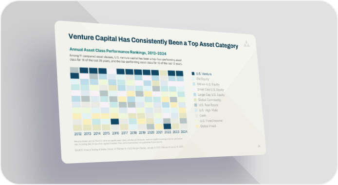 Venture Capital Has Consistently Been a Top Asset Category Returns shown are for the U.S. venture capital asset class, not Alumni Ventures. Venture capital investing involves substantial risk, including risk of loss of all capital invested. Past performance does not guarantee future results. SOURCE: Edward Stanley & Matias Ovrum, 10 Themes for 2025, Morgan Stanley, January 9, 2025. Data as of January 6, 2025. Annual Asset Class Performance Rankings, 2012–2024 Among 11 compared asset classes, U.S. venture capital has been a top-four-performing asset class for 16 of the last 25 years, and the top-performing asset class for 10 of the last 12 years. 24