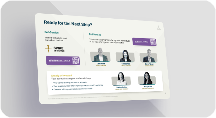 SCHEDULE A CALL VIEW FUND MATERIALS Dan Burns SENIOR PARTNER Stephanie King SENIOR VICE PRESIDENT Hilary Ncala SENIOR VICE PRESIDENT Stacey Tsai Ready for the Next Step? Already an investor? Your account managers are here to help. “First Call” for anything you need as an investor They ensure you know what’s in your portfolio and how it’s performing Can assist with any administrative questions or needs 16 Darrin Wizst Talk to our Senior Partners for a guided walkthrough of our fund offerings and how to get started. Visit our website to read more about the fund. Self-Service Full Service SENIOR PARTNER SENIOR PARTNER Alumni Ventures and its personnel provide advice only to affiliated venture capital funds. Any discussion with AV personnel is not personalized advice to any participant.