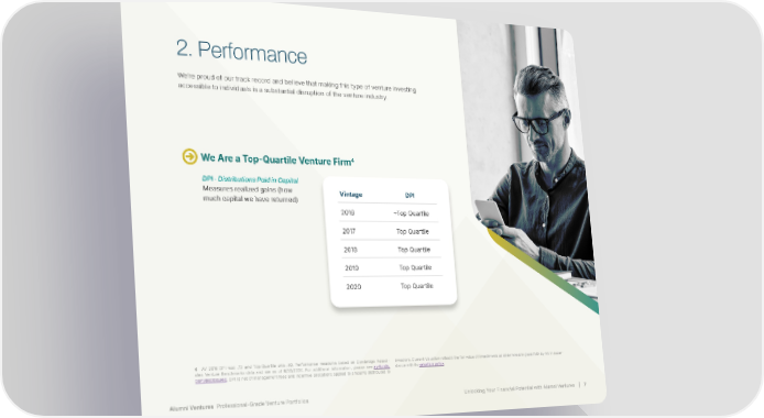 Alumni Ventures Professional-Grade Venture Portfolios Unlocking Your Financial Potential with Alumni Ventures | 7 2. Performance We’re proud of our track record and believe that making this type of venture investing accessible to individuals is a substantial disruption of the venture industry. Vintage DPI 2016 ~Top Quartile 2017 Top Quartile 2018 Top Quartile 2019 Top Quartile 2020 Top Quartile 4 AV 2016 DPI was .72 and Top Quartile was .80. Performance measures based on Cambridge Associ- ates Venture Benchmarks data and are as of 6/30/2024. For additional information, please see av-funds. com/disclosures. DPI is net of management fees and incentive allocations applied to amounts distributed to investors. Current Valuation reflects the fair value of investments as determined in good faith by AV in accor- dance with its valuation policy. We Are a Top-Quartile Venture Firm4 DPI - Distributions Paid in Capital Measures realized gains (how much capital we have returned)